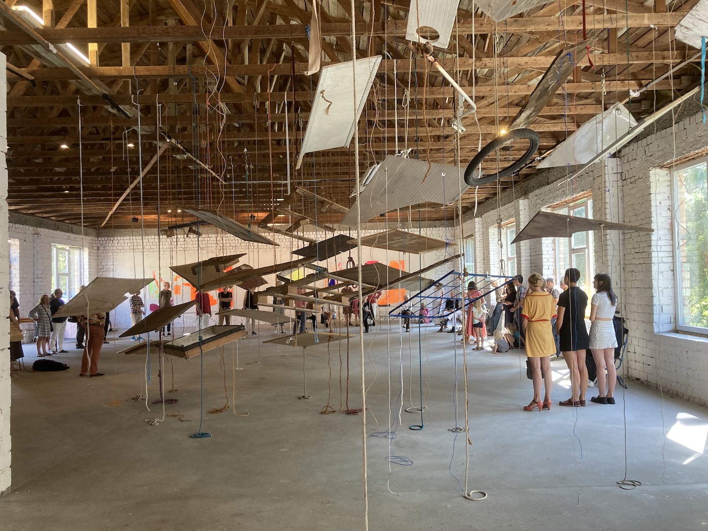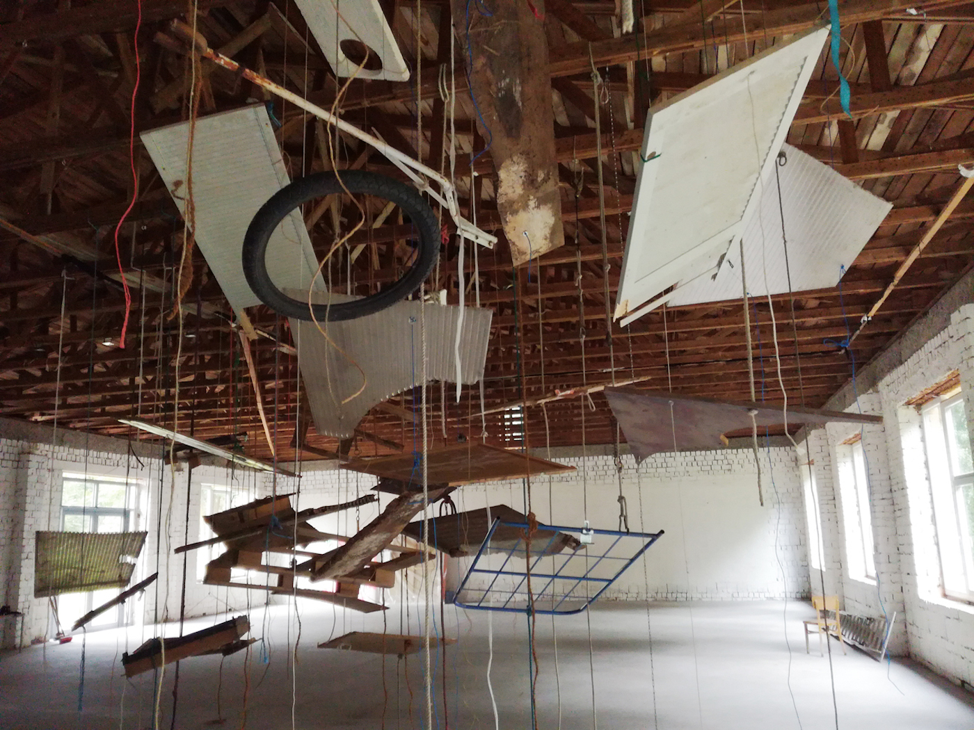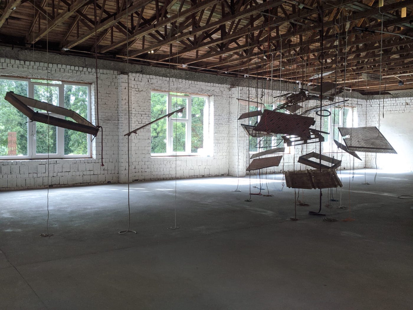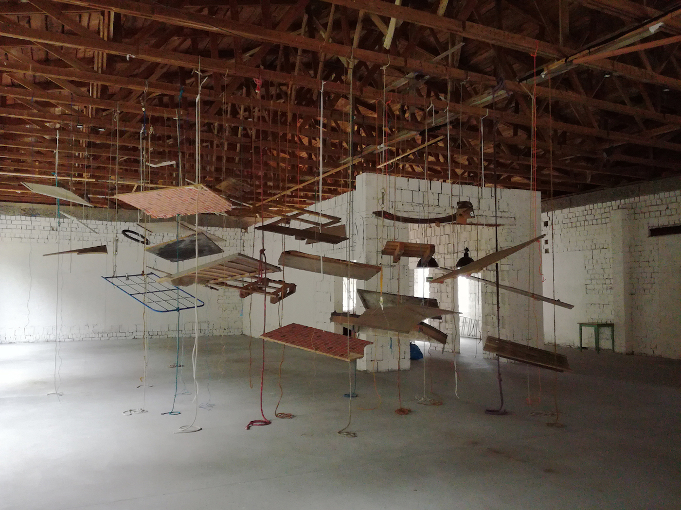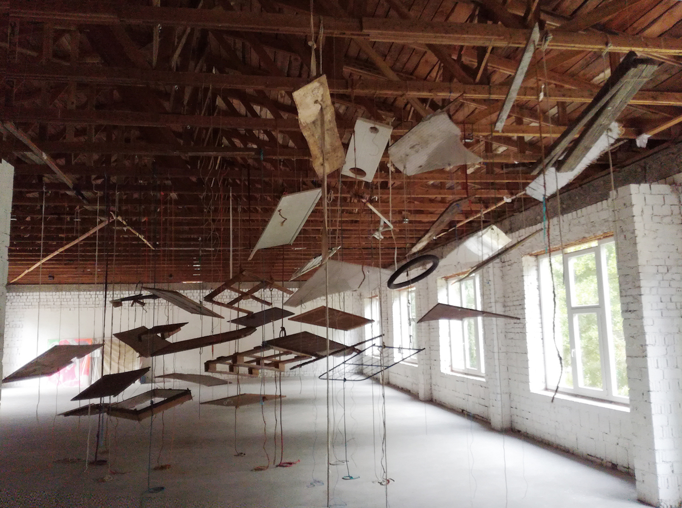 Die Materialien für die Installation habe ich aus den Lagerhallen des LIKK zusammengetragen. Es sind verstaubte, beschädigte und undefinierbare Bruchstücke, Gestänge und Platten vergangener Projekte. Diese Elemente sind in einer Art Materialwolke, vom Gebälk der Kunsthalle an alten Seilen herabhängend, angeordnet. Scheinbar von einer Strömung getragen, schweben die Teile in einer kollektiven Formation von der Raummitte in einer aufsteigenden Kurve mit einem Sog in Richtung Fenster, ins Freie.