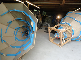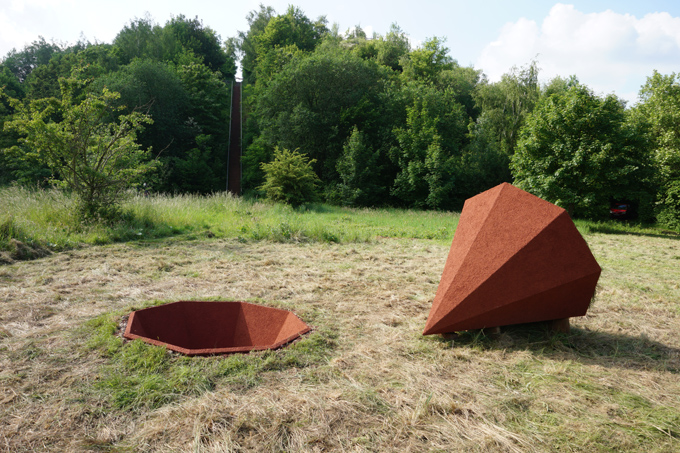 8eckiger Kegel und Trichter, je 180 x 150 cm, Spanplatten mit Haldenschlacke beschichtet