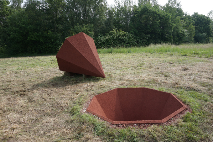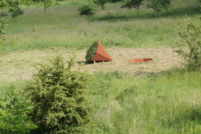 Die Arbeit "Bodenprobe" spielt mit der geologischen Erkundung des Untergrunds. Das Setup besteht aus einem achteckigen Kegel, der neben einer trichterförmigen Bodenvertiefung mit den gleichen Raummaßen liegt. Anscheinend wurde die Kegelform vor Ort exakt aus dem Boden herausgestochen. Die mit Gras bewachsene Oberseite des Kegels ist mit dem Pflanzenwuchs der Umgebung identisch, ebenso gleichen seine Seitenflächen der Bodenbeschaffenheit innerhalb der Vertiefung.