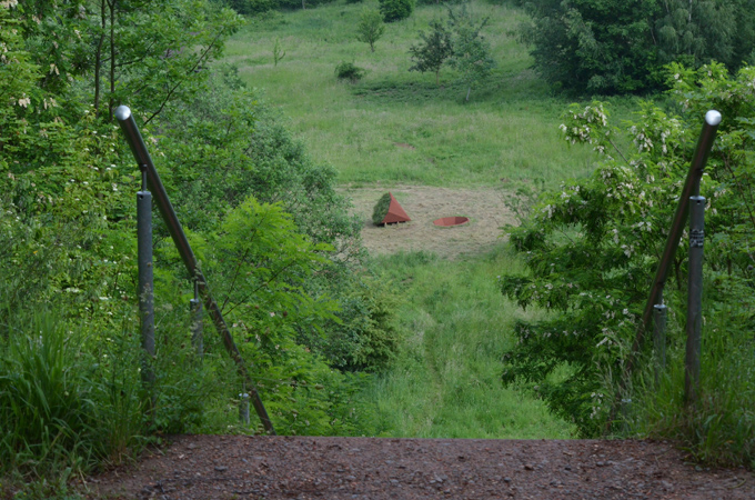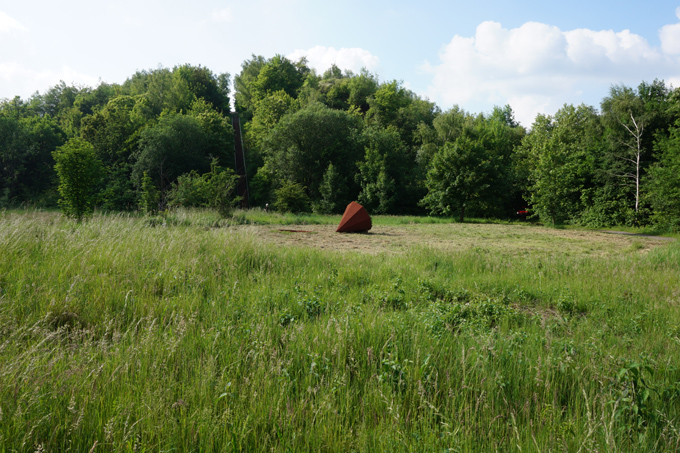 Eine formale Referenz ergibt sich durch die liegende Kegelform am Fuße des Haldenkegels, der ebenfalls aus roter Schlacke besteht. Von oben ist die Installation als roter Punkt in der Landschaft sichtbar.