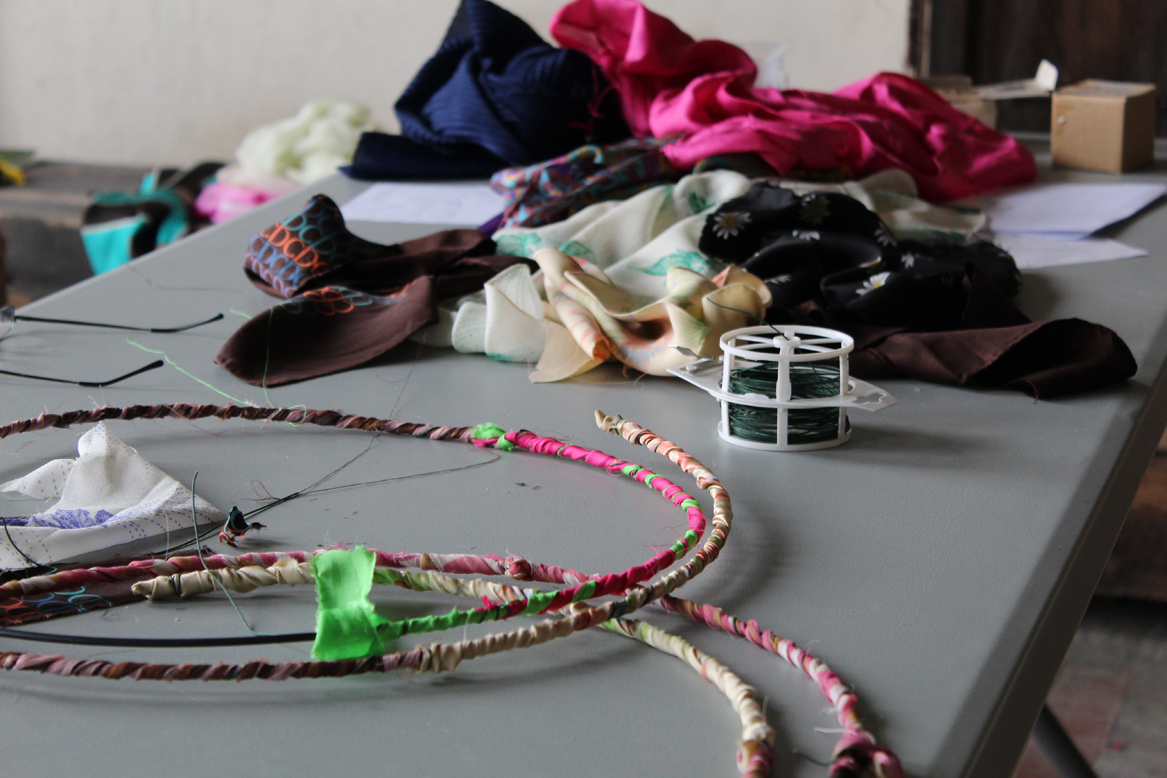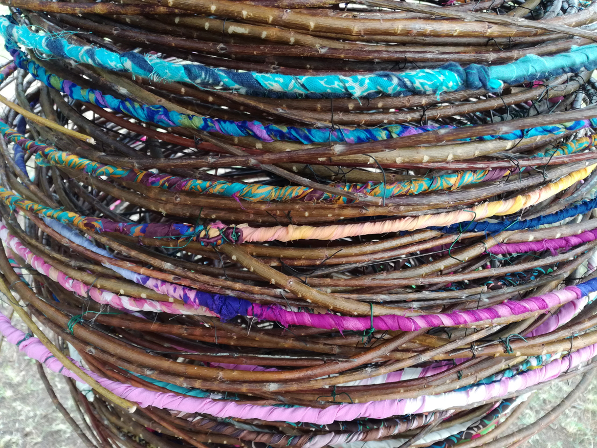In die Struktur sind bunte Seidenschals eingearbeitet, gespendet von Frauen, die dort heute beschäftigt sind. Die Spindel ist eine Hommage an die Frauen, die früher aus den Kokons der Seidenraupen Faden herstellten.