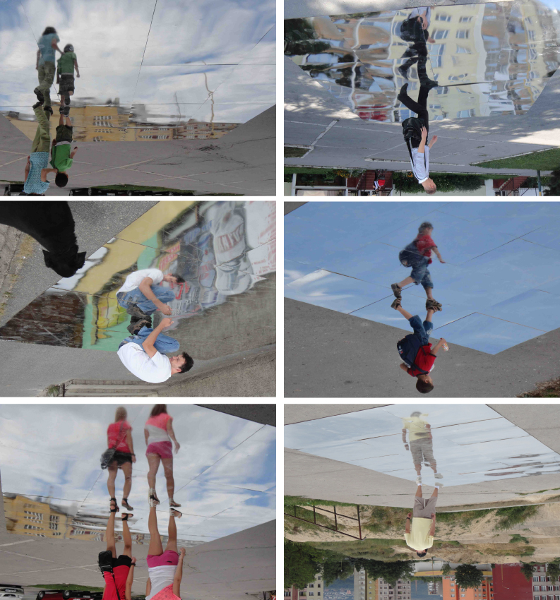 Upside-down images of live stream video presented on the monitors during the simultaneous actions