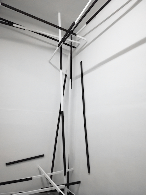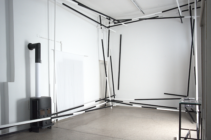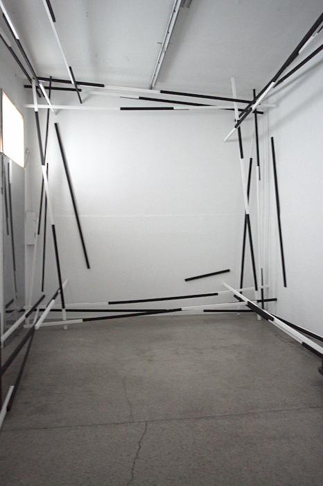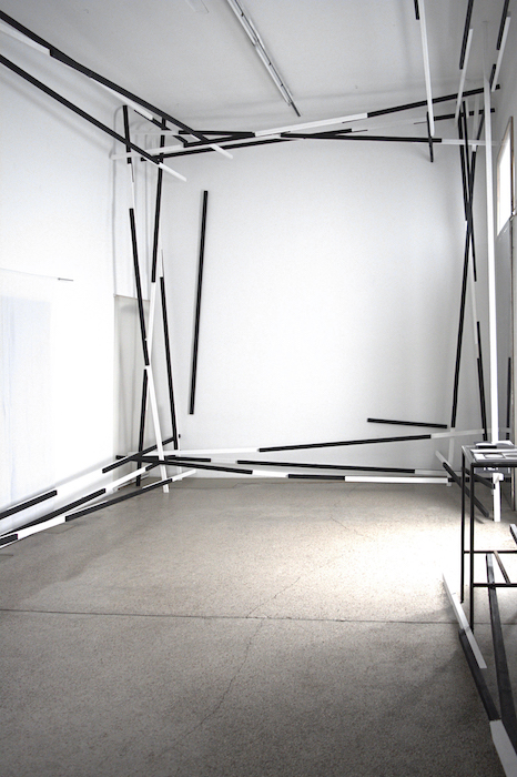 Der Raum bleibt zwischen Statik und Dynamik stecken. Beunruhigend ist die enge Beziehung zwischen Installation und tatsächlichem Raum. Hält die Konstruktion (noch) den Raum oder bebt (schon) die Umgebung?