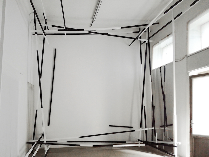 Material: 300m Dachlatten, schwarze und weiße FarbeObjektmaße: 9m x 4,70m x 4,70m