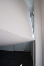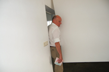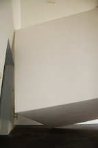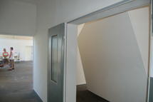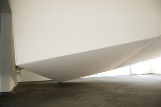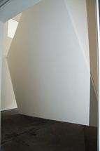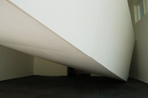 So komplex der strategische Ansatz ist, so einfach erscheint die formale Konstellation. Ein geschlossener Quader wird in einen quaderförmigen Ausstellungsraum schräg verkantet. Der Raum ist der Vertikalität und der Horizontalität verpflichtet. In seiner Proportion und Funktionalität entspricht er menschlichem Maß und Erfordernissen. Mithin kann man von Architektur sprechen. Es ist ein so genannter "white cube", eine einfache "Schachtel", die in ihrer Neutralität sich nicht selbst in den Vordergrund schiebt, sondern ganz der Funktion als Ausstellungsraum genügt: weiß und rechtwinklig. So soll das ausgestellte Werk zu seiner vollkommenen Wirkung kommen, ohne dass man als Betrachter vom Raum und seiner Ausgestaltung abgelenkt wird.
