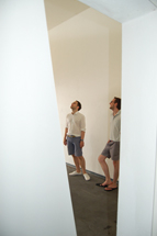 Da ein solcher Körper sechs Seiten aber acht Ecken hat, geht hier eine gewisse Symmetrie und sogar &Aml;hnlichkeit verloren. Es bleiben zwei Ecken "in der Luft" hängen. So sehr es sich also um zwei gleiche Körper handelt, so sehr behindern sie sich in dieser spezifischen Konstellation gegenseitig. Die Größe des inneren Körpers ist direkt abhängig von der Größe des äußeren Raumes. Wenn aber Ausstellungsraum und Ausstellungsexponat in so unmittelbarer Beziehung stehen, bleibt für weitere Relationen kaum Platz. Die entstehenden Negativräume zwischen äußerem Raum und innerem Körper sind selbst aber geometrische Figuren von eigener Bedeutung. Diese Zwischenräume fixieren wie Keile den inneren Quader und distanzieren ihn zugleich von den äußeren Raumflächen.